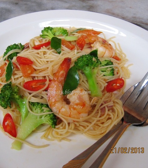 200 gram spaghetti angel hari, rebus hingga lembut, gaul dengan minyak zaitun